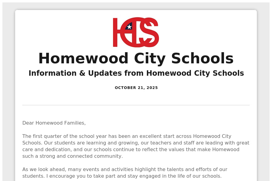 Homewood City Schools Information & Updates from Homewood City Schools October 21, 2025 Dear Homewood Families, The first quarter of the school year. . .