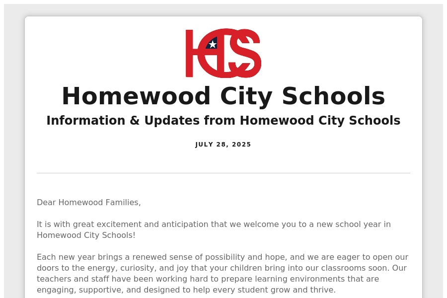 Homewood City Schools Information & Updates from Homewood City Schools July 28, 2025 Dear Homewood Families, It is with great excitement and anticip. . .